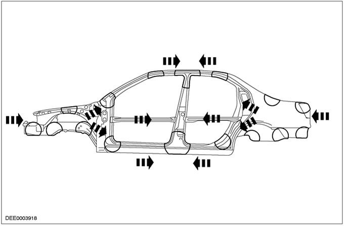 - При оценке повреждения кузова всегда следует проверять заданные места деформирования кузова. Заданные места деформирования — это преднамеренно «ослабленные сечения», создаваемые посредством местного изменения формы сечения, которые первыми будут подвергаться воздействию внешних сил.