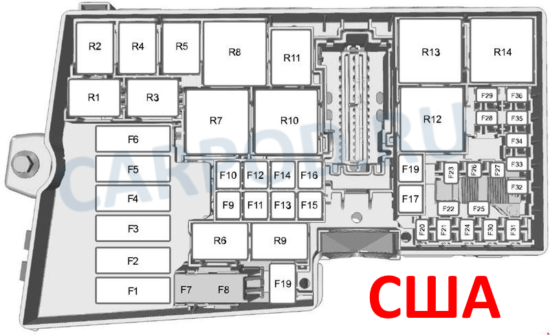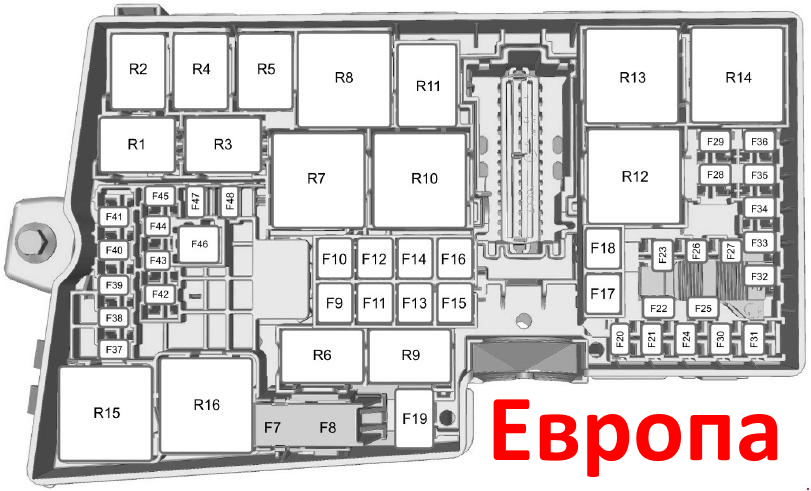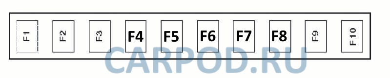 29 | Многофункциональный блок управления — в блоке предохранителей/реле под приборной панелью -функции: Противоугонная система, центральный замок, противотуманные фары, топливный насос, фары, указатели поворота/аварийная сигнализация, лампы освещения салона, очиститель/омыватель заднего стекла, фонари заднего хода, очиститель/омыватель лобового стекла |