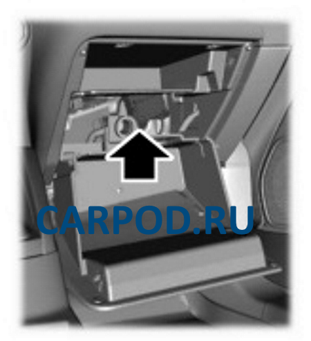 Для доступа: 1. Откройте бардачок и выньте из него содержимое. 2. Открутите четыре винта, а затем снимите полку. 3. Отстегните боковую обшивку. 4. Снимите бардачок.