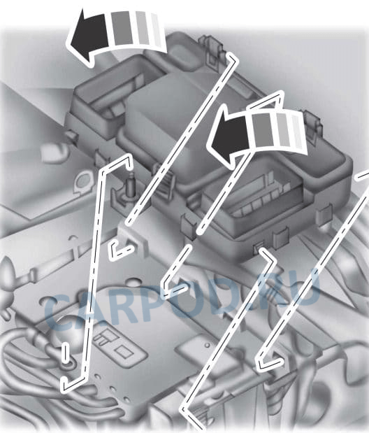 Нижний отдел. Откройте две защелки, расположенные по обеим сторонам блока предохранителей. Снимите внутреннюю сторону блока с опоры. Переместите блок в центр моторного отсека и приподнимите внешнюю сторону блока для доступа к ее нижней части.