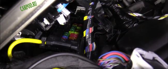 Монтажный блок с водительской стороны внизу панели приборов. Для доступа к нему надо снять часть обшивки.