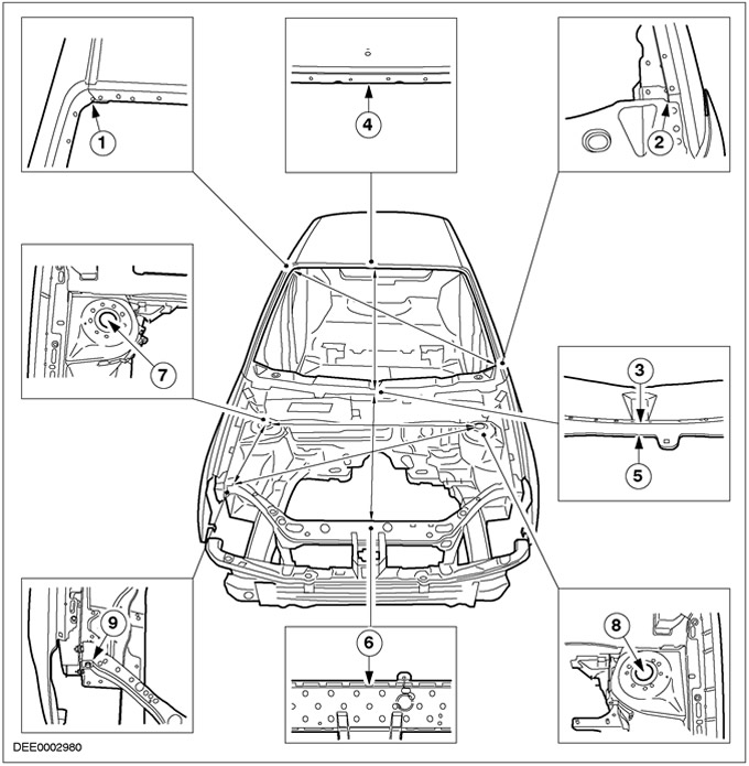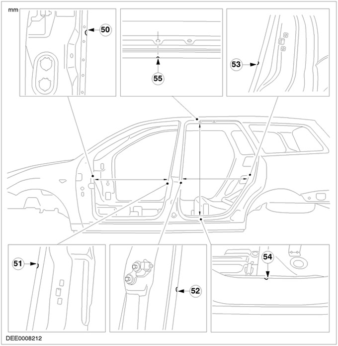 8. Размеры кузова — 4/ 5-дверный вариант — вид сбоку. Все размеры имеют допуск ± 3 мм. Все размеры откладываются от центра отверстия или края панели, используя симметрично отрегулированный штангенциркуль.