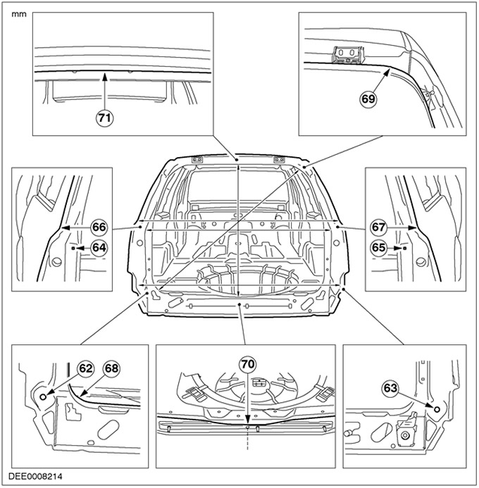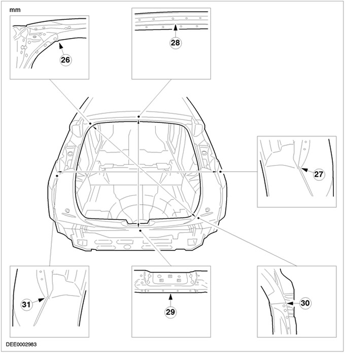 14. Размеры кузова — 5-дверный вариант — вид сзади. Все размеры имеют допуск ± 3 мм. Все размеры откладываются от центра отверстия или края панели, используя симметрично отрегулированный штангенциркуль.