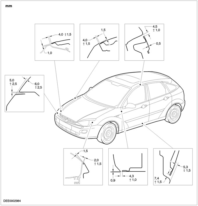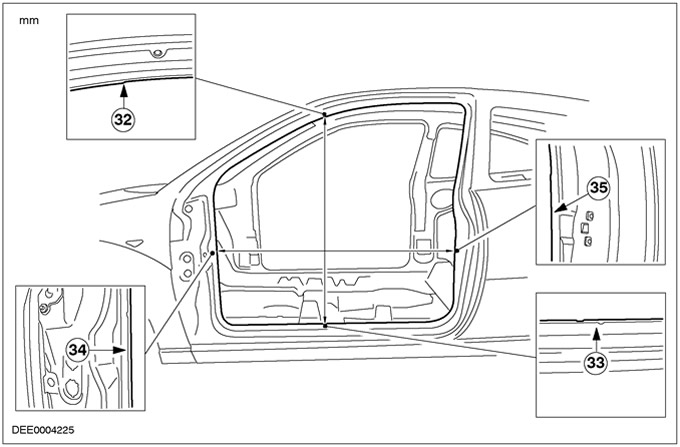 4. Размеры кузова — 3-дверный вариант — вид сбоку. Все размеры имеют допуск ± 3 мм. Все размеры откладываются от центра отверстия или края панели, используя симметрично отрегулированный штангенциркуль.