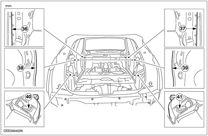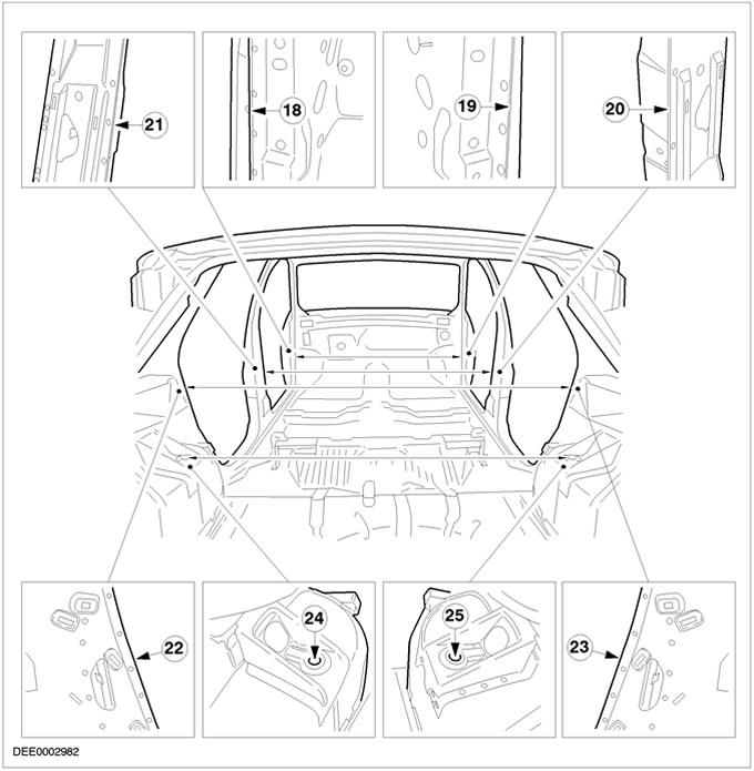12. Размеры кузова — 4-дверный вариант — вид сзади. Все размеры имеют допуск ± 3 мм. Все размеры откладываются от центра отверстия или края панели, используя симметрично отрегулированный штангенциркуль.