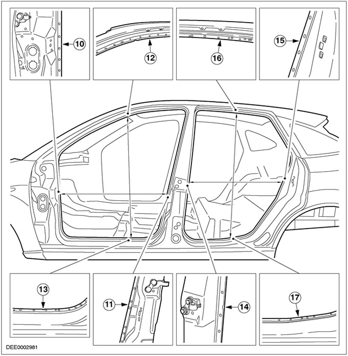 16. Размеры кузова — «универсал» — вид сбоку. Все размеры имеют допуск ± 3 мм. Все размеры откладываются от центра отверстия или края панели, используя симметрично отрегулированный штангенциркуль.