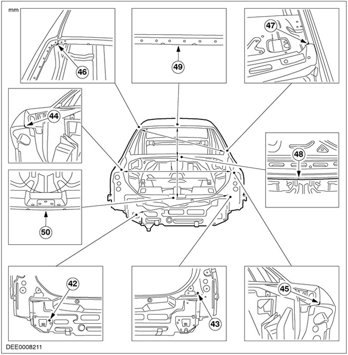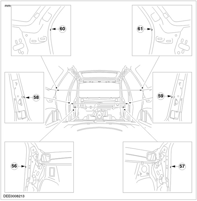 10. Размеры кузова — 5-дверный вариант — салон автомобиля. Все размеры имеют допуск ± 3 мм. Все размеры откладываются от центра отверстия или края панели, используя симметрично отрегулированный штангенциркуль.