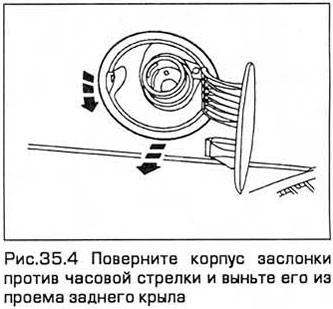 4. Снимите крышку горловины. Выверните стопорный винт горловины. Затем поверните корпус заслонки против часовой стрелки примерно на 30° и выньте его из проема заднего крыла (см. рис.35.4).