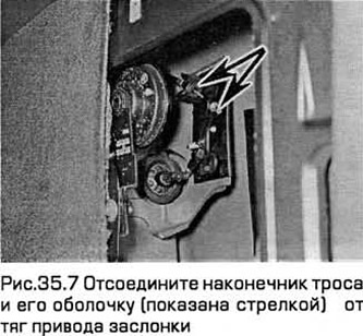7. Отсоедините трос открытия от тяг привода заслонки (см. рис.35.7). Привяжите веревку к наконечнику троса.